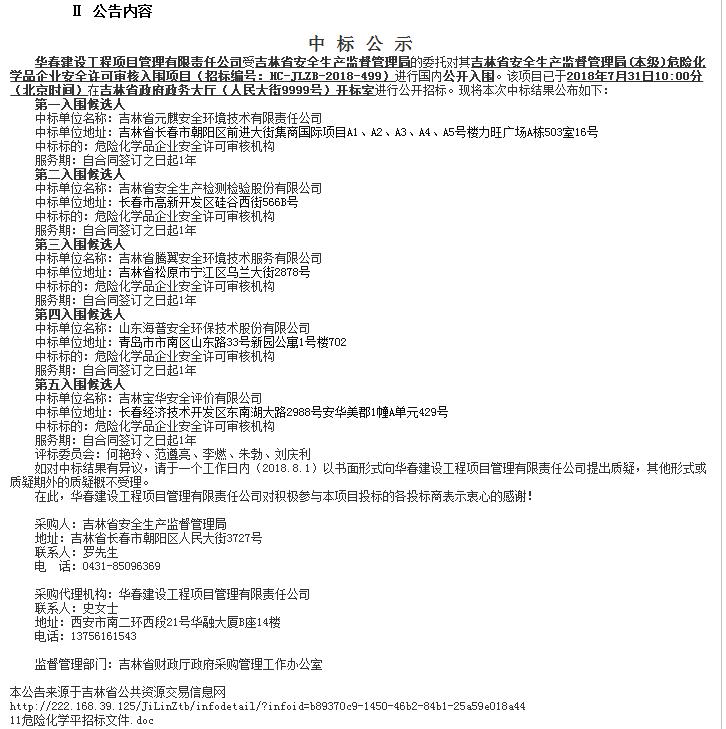 •        我公司報名參加的吉林省安全生產(chǎn)監(jiān)督管理局(本級)危險化學品企業(yè)安全許可審核項目公開招標項目,于2018年7月31日10:00在吉林省人民政府政務(wù)大廳評標室開標。省內(nèi)、外共8戶機構(gòu)參與了本次招標,經(jīng)過專家的評定,我公司成功成為入圍機構(gòu)。