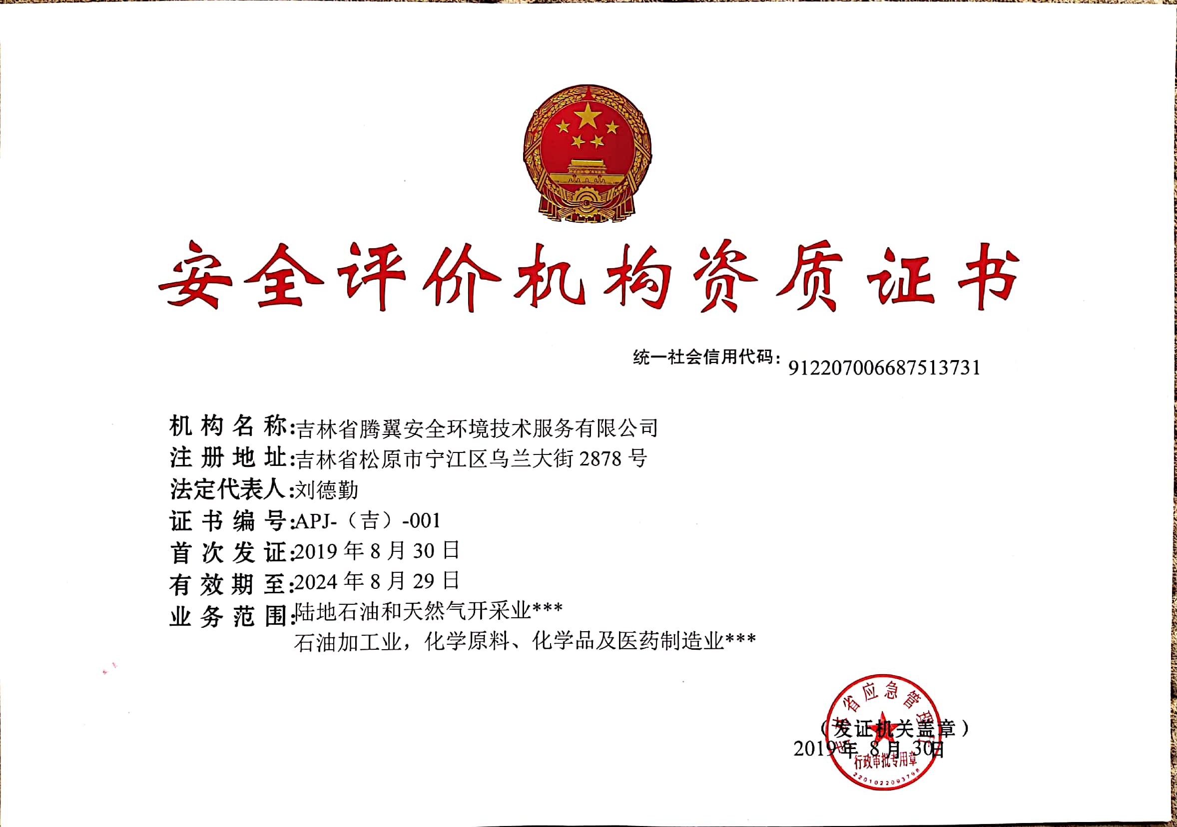 •  我公司于20198月1日向吉林省應急管理廳進行了安全評價機構資質證書申請, 2019830日通過審批,取得安全評價機構資質證書。