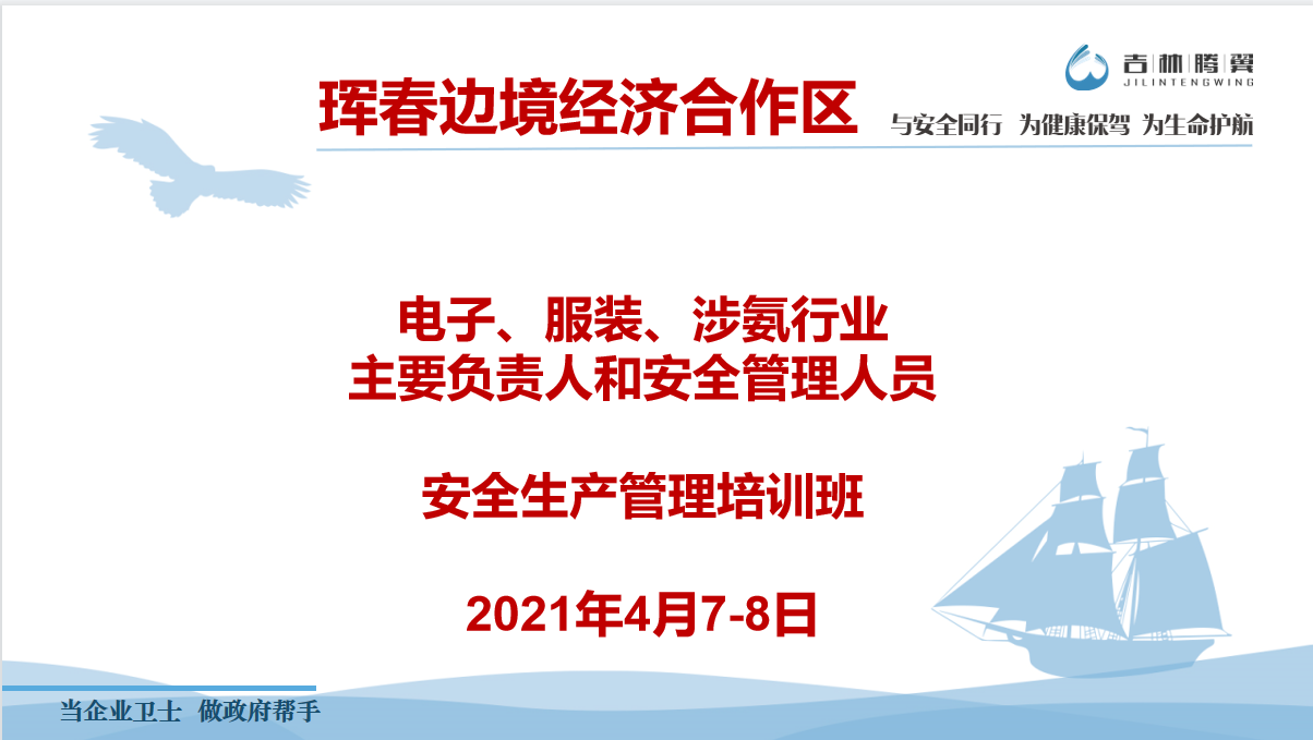 • 2021年4月7日,受延邊州琿春市邊境經(jīng)濟合作區(qū)的委托,我公司為該區(qū)電子、服裝及涉氨行業(yè)的企業(yè)主要負責(zé)人和安全管理人員進行了安全生產(chǎn)管理知識培訓(xùn)。
