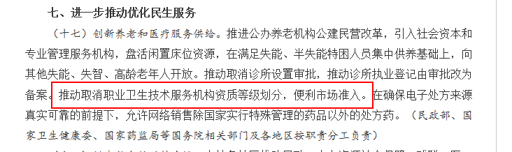 (十七)創(chuàng)新養(yǎng)老和醫(yī)療服務(wù)供給。推進(jìn)公辦養(yǎng)老機(jī)構(gòu)公建民營改革,引入社會(huì)資本和專業(yè)管理服務(wù)機(jī)構(gòu),盤活閑置床位資源,在滿足失能、半失能特困人員集中供養(yǎng)基礎(chǔ)上,向其他失能、失智、高齡老年人開放。推動(dòng)取消診所設(shè)置審批,推動(dòng)診所執(zhí)業(yè)登記由審批改為備案。推動(dòng)取消職業(yè)衛(wèi)生技術(shù)服務(wù)機(jī)構(gòu)資質(zhì)等級劃分,便利市場準(zhǔn)入。在確保電子處方來源真實(shí)可靠的前提下,允許網(wǎng)絡(luò)銷售除國家實(shí)行特殊管理的藥品以外的處方藥。(民政部、國家衛(wèi)生健康委、國家藥監(jiān)局等國務(wù)院相關(guān)部門及各地區(qū)按職責(zé)分工負(fù)責(zé))