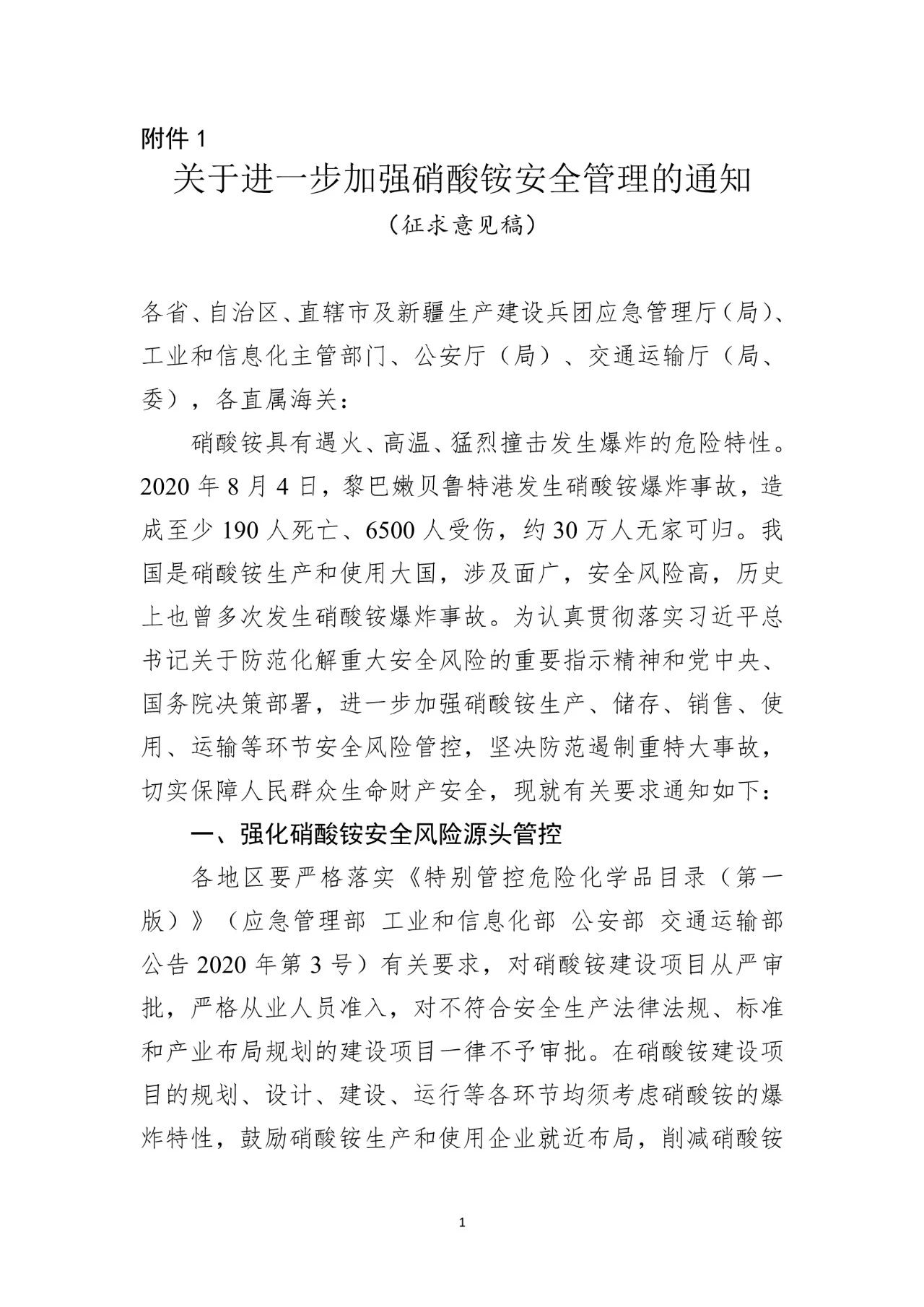 5月26日應(yīng)急管理部發(fā)布關(guān)于征求《關(guān)于進(jìn)一步加強(qiáng)硝酸銨安全管理的通知(征求意見(jiàn)稿)》意見(jiàn)的函