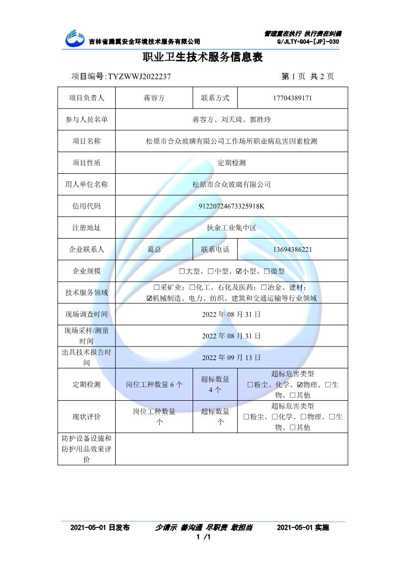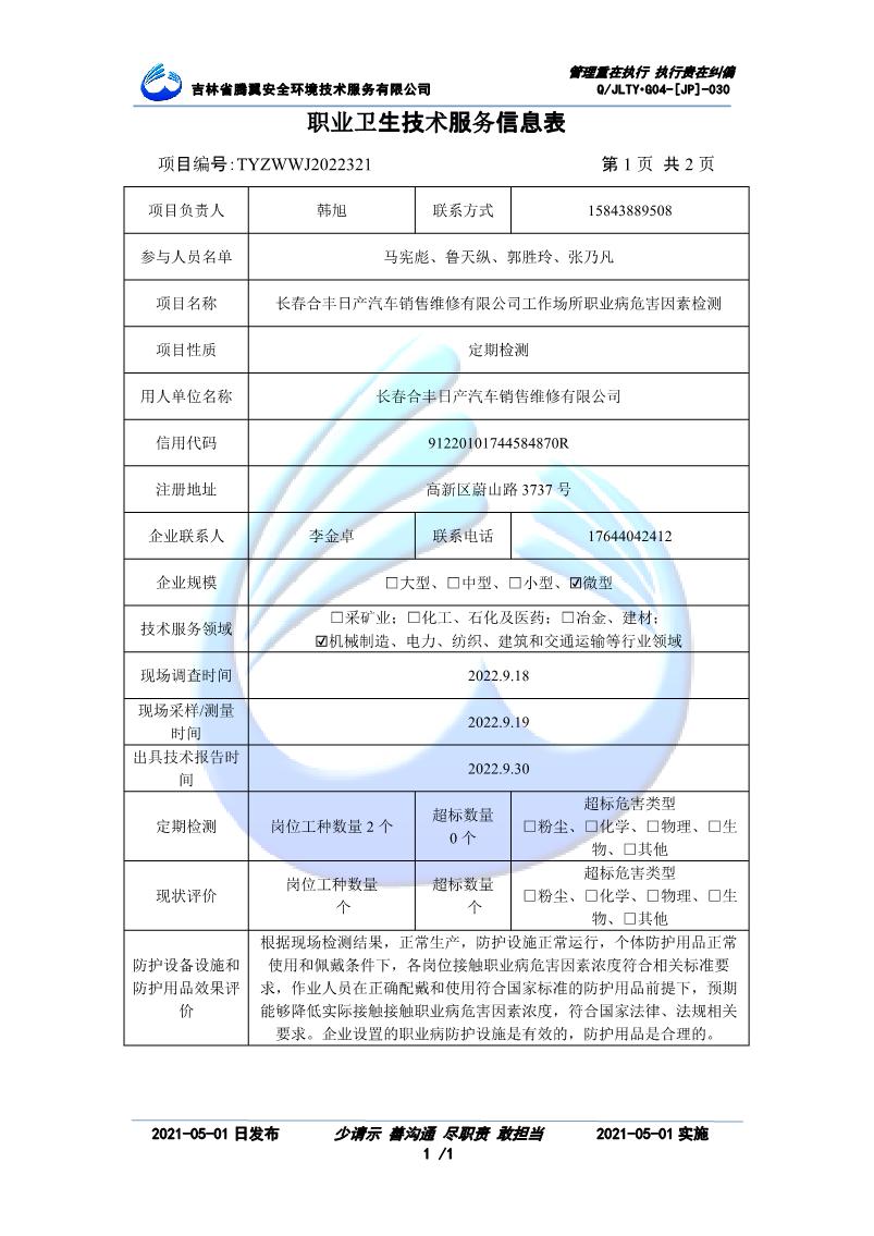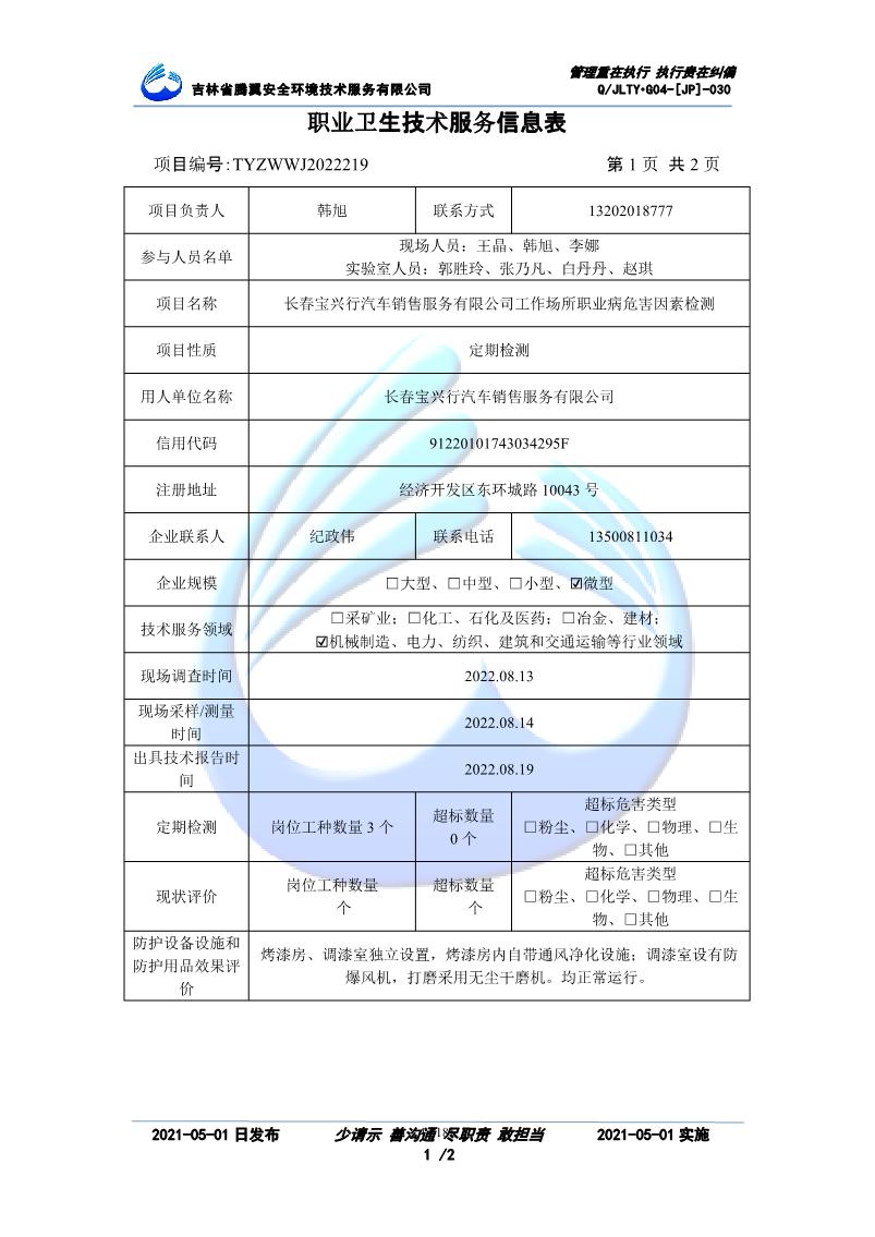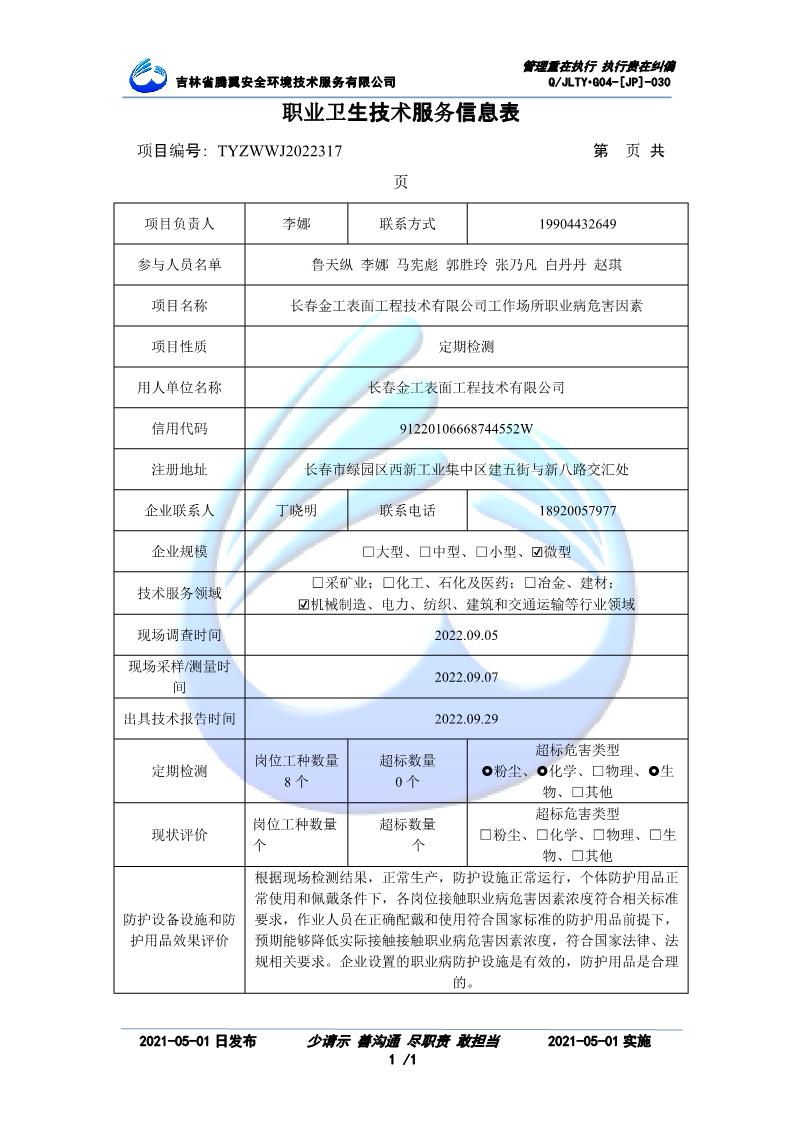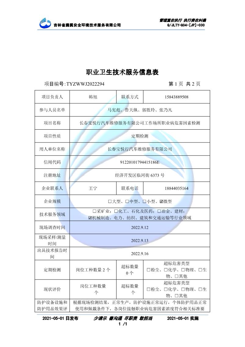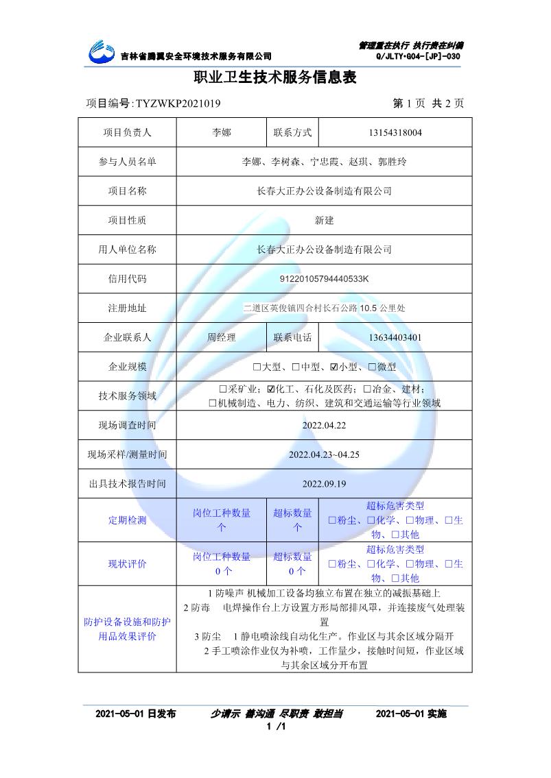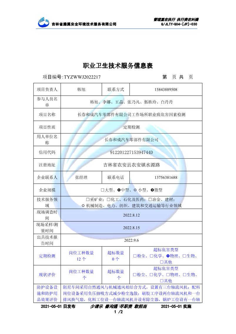 吉林省騰翼安全環(huán)境技術(shù)服務(wù)有限公司于2007年10月30日在松原市注冊(cè)成立,現(xiàn)總部位于長春北湖科技園,2008年6月3日取得安全評(píng)價(jià)機(jī)構(gòu)乙級(jí)資質(zhì),2017年1月5日取得職業(yè)衛(wèi)生技術(shù)服務(wù)機(jī)構(gòu)乙級(jí)資質(zhì),自相繼獲取安評(píng)和職評(píng)資質(zhì)至2020年間,公司以打造“中國首屈一指的安全生產(chǎn)、職業(yè)健康、生態(tài)環(huán)保一站式綜合服務(wù)體”為發(fā)展目標(biāo)。目前,公司可為各類委托方提供安全與職業(yè)衛(wèi)生評(píng)價(jià),職業(yè)衛(wèi)生與...